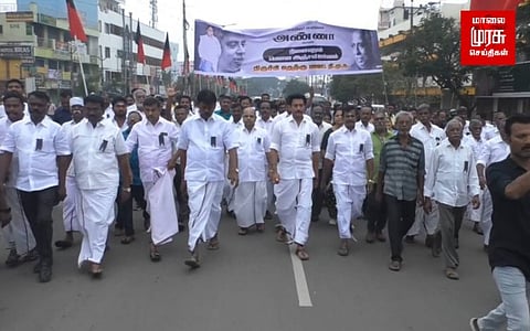 அண்ணா பிறந்த நாளை முன்னிட்டு திருச்சியில் அமைச்சர் அன்பில் மகேஷ் பொய்யாமொழி தலைமையில் திமுக தொண்டர்கள் ஊர்வலமாக சென்று அண்ணா சிலைக்கு மரியாதை செலுத்தினர். அந்நிகழ்வைத் தொடர்ந்து செய்தியாளர்களிடம் பேசிய அவர், தமிழ்நாடு முழுவதும் அண்ணாவின் புகழை பறைசாற்றும் விதத்தில் அமைதி பேரணி நடைபெற்று வருகிறது. அதன் ஒரு பகுதியாக திருச்சி தெற்கு மாவட்ட திமுக சார்பில் இந்த பேரணி நடைபெற்றதாக தெரிவித்தார்.