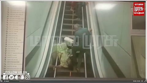திருச்சி ஜங்ஷன் ரயில் நிலையத்தில், வயதான பெண் ஒருவர் நகரும் படிக்கட்டில் (Escalator) பயணித்து கொண்டிருந்தார். அப்போது எதிர்பாராத அவர் பின்புறமாக சரிந்து விழுந்தார்.