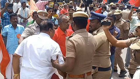 தொடர்ந்து ரயில் மறியல் செய்ய முயன்று, போலீசாரின் தடுப்புகளை மீறி ரயில் நிலையத்துக்குள் ஓடிச் சென்றனர். அப்போது சிலரின் உடைகளை போலீசார் கிழித்ததால், போராட்டக்காரர்களுக்கும் போலீசாருக்கும் இடையே தள்ளுமுள்ளு ஏற்பட்டதால் பரபரப்பு நிலவியது.