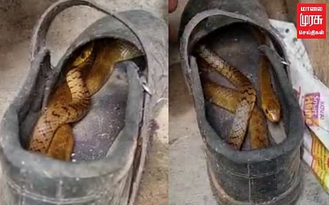 மதுரையில் ஷூ-வுக்குள் உறங்கிய இரண்டடி நீள சாரைப்பாம்பை பாம்பு பிடி வீரர் பத்திரமாக மீட்டுள்ளார்.