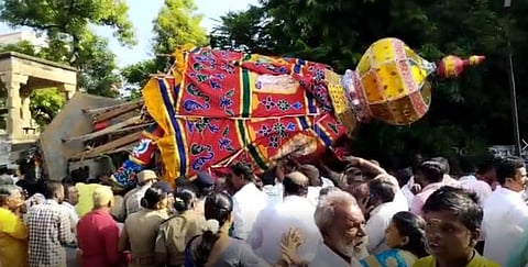 கடந்த 9 நாட்களுக்கு மேல் நடைபெற்ற கோவில் திருவிழாவில் முக்கிய நிகழ்வான தேர் ஊர்வலம் இன்று நடைபெற்றது. அப்போது ஊர்வலத்திற்காக தேரை எடுத்த போது, தேர் இரண்டு அடி எடுத்து வைக்குமுன்னரே, திடீரென ஒரு பக்கமாக சாய்ந்து பக்தர்கள் மீது விழுந்தது. இதில் 10 க்கும் மேற்பட்டோர் படுகாயமடைந்தனர். தகவலறிந்து சம்பவ இடத்திற்கு விரைந்து வந்த போலீசார், காயமடைந்தவர்களை உடனடியாக மீட்டு மருத்துவமனையில் அனுமதித்தனர். பின்னர் இது குறித்து போலீசார் விசாரணை மேற்கொண்டனர்.