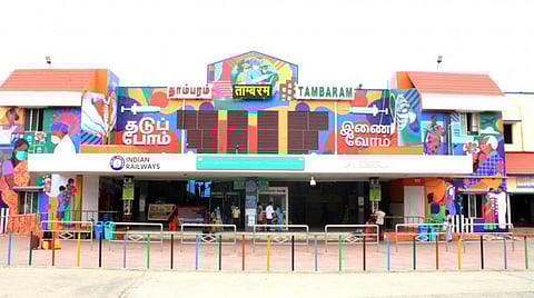 சென்னை தாம்பரம் ரயில் நிலையம் முழுவதும் கொரோனா விழிப்புணர்வு ஏற்படுத்தும் விதமாக ஓவியங்கள் வரையப்பட்டுள்ளன.