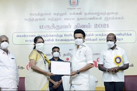 மேடையில் மருத்துவர்களுக்கு விருதுகளை வழங்குவதற்காக, முதலமைச்சருக்கு விருதுகளை எடுத்து சென்ற நந்தினி என்ற பெண்ணுக்கு நேற்று கொரோனோ தொற்று இருப்பது உறுதி செய்யப்பட்டது.