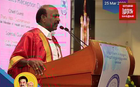 சென்னை கிண்டியில் உள்ள டாக்டர் எம்.ஜி.ஆர். மருத்துவப் பல்கலைக்கழக வளாகத்தில் அரசு பல்மருத்துவக் கல்லூரி பட்டமளிப்பு விழா நடைபெற்றது. இதில் பங்கேற்ற சுகாதாரத்துறை அமைச்சர் மா.சுப்பிரமணியன் 2017 - 2022 ஆம் கல்வி ஆண்டில் பயின்ற 86 இளங்கலை பல் மருத்துவ மாணவா்களுக்கு பட்டங்களை வழங்கினார்.