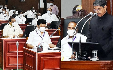 ஆளுநருக்கு உரிய மரியாதை அளித்து எதிர்ப்பு தெரிவிக்காமல் இருந்ததாகவும், ஆனால் சமூகநீதி, சமத்துவம், பெண்ணடிமை உள்ளிட்ட வார்த்தைகளை அவர் பேச மறுத்துவிட்டதாகவும், தங்கம் தென்னரசு குற்றம்சாட்டினார். சனாதான கொள்கைகளை சட்டப்பேரவைக்கு கொண்டு வருவது ஏற்புடையது அல்ல எனவும், ஆளுநரோடு அதிமுகவும் தேசிய கீதத்தை புறக்கணித்தது அவமானமானது எனவும் அமைச்சர் கூறினார். அண்ணா பெரியார் பெயர்களை உச்சரிக்க மாட்டேன் என கூறிய ஆளுநரை கண்டிக்காமல், அடிமை சாசனத்தை எழுதி கொடுத்துள்ளது போல அதிமுக தேசிய கீதம் இசைக்கும் முன் வெளியேறி இருப்பதாகவும் தங்கம் தென்னரசு விமர்சனம் செய்தார்
