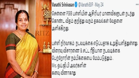 இந்தநிலையில், பிஎஸ்பிபி பள்ளி ஆசிரியர் மாணவர்களிடம் தகாத முறையில் நடந்து கொண்ட விதம் குறித்து வரும் தகவல்கள் வேதனை அளிப்பதாக பாஜக தேசிய மகளிர் அணி தலைவி வானதி சீனிவாசன் டுவிட்டர் பக்கத்தில் குறிப்பிட்டுள்ளார். மேலும் பள்ளி நிர்வாகம் நடவடிக்கை எடுப்பதாக உறுதியளித்திருப்பது, விரைவு விசாரணை மற்றும் சட்ட ரீதியான நடவடிக்கை ஆகியன