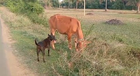 ரிஷிவந்தியம் பகுதியை சேர்ந்தவர் விவசாயி ராஜேந்திரன். இவர் தனது மாடு மற்றும் நாயை ஒன்றாக வளர்த்து வந்துள்ளார். தற்போது சுட்டெரிக்கும் வெயிலால் அவரால் மாடு மேய்ச்சலுக்கு ஓட்டிச் செல்ல முடியவில்லை.