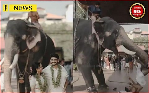 கேரள மாநிலம் குருவாயூரில் திருமண போட்டோ சூட் கிடையே திடீரென மிரண்ட யானை தும்பிக்கையால் பாகானை தலைகீழாக தூக்கும் காட்சி இணையதளங்களில் வைரல் ஆகி வருகிறது.