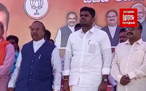 கர்நாடக மாநிலம் சிவமொகா நகரில் தமிழர்கள் இடையே வாக்கு சேகரிப்பு கூட்டத்தில் அண்ணாமலை முன்னிலையில் தமிழ் தாய் வாழ்த்தை பாதியில் நிறுத்தி கன்னட நாட்டு கீதத்தை பாட வைத்துள்ளார் ஈஸ்வரப்பா.