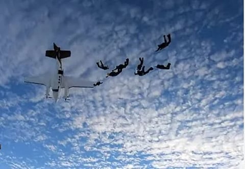 அப்போது நெடி பொழுதில் விமானத்தில் இருந்து குவித்து சாகசன் செய்து அசத்திய ஸ்கை டைவர்ஸ் குழு-வின் வீடியோ இணையத்தில் வைரலாகி வருகிறது.