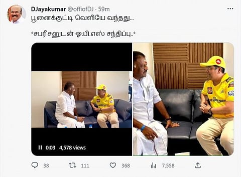 இதையடுத்து அமைச்சர் ஜெயக்குமார் தனது ட்விட்டர் பக்கத்தில், " பூனைக்குட்டி வெளியே வந்தது " என கூறி ஓபிஎஸ் மற்றும் சபரீசன் புகைப்படங்களை பகிர்ந்துள்ளார்.