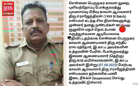 இந்நிலையில் பொறுப்புடன் இருக்க வேண்டிய காவல் ஆய்வாளர் ராஜேந்திரன், மதம் தொடர்பான கருத்துக்களை ஆடியோவாக பதிவிட்டதற்காக சென்னை பெருநகர காவல் ஆணையாளர் சந்தீப் ராய் ரத்தோர், இந்திய காவல் படை அவர்களின் உத்தரவின் பேரில், ராஜேந்திரனை தற்காலிக பணி இடைநீக்கம் செய்து உத்தரவிட்டுள்ளார்.
