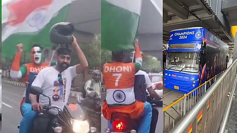 இருபது ஓவர் உலகக் கோப்பையை வென்ற இந்திய அணி மேற்கு இந்தியத் தீவுகள் நாட்டின் பார்படாஸ் நகரில் இருந்து இன்று காலை தனி விமானத்தில் டெல்லி வந்தடைந்தனர். டெல்லி விமான நிலையத்தில் இருந்து இந்திய அணி வீரர்கள் நட்சத்திர விடுதிக்கு சென்றனர். அப்போது தோனியின் ரசிகர் ராம் பாபு தனது உடல் முழுவதும் தேசியக் கொடி வண்ணத்தை பூசிக்கொண்டு இருசக்கர வாகனத்தில் தேசியக் கொடியை பறக்கவிட்டவாறு பேருந்தை பின் தொடர்ந்து சென்று வீரர்களை உற்சாகப்படுத்தினார்.